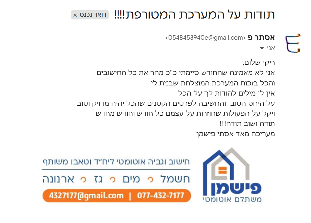 "ריקי שלום, אני לא מאמינה שהחודש סיימתי כל כך מהר את כל החישובים, והכל בזכות המערכת המוצלחת שבנית לי. אין לי מילים להודות לך על הכל – על היחס הטוב והחשיבה לפרטים הקטנים כדי שהכל יהיה מדויק וטוב, ויקל על הפעולות שחוזרות על עצמן כל חודש מחדש. תודה ושוב תודה!!! מעריכה מאד אסתי פישמן."