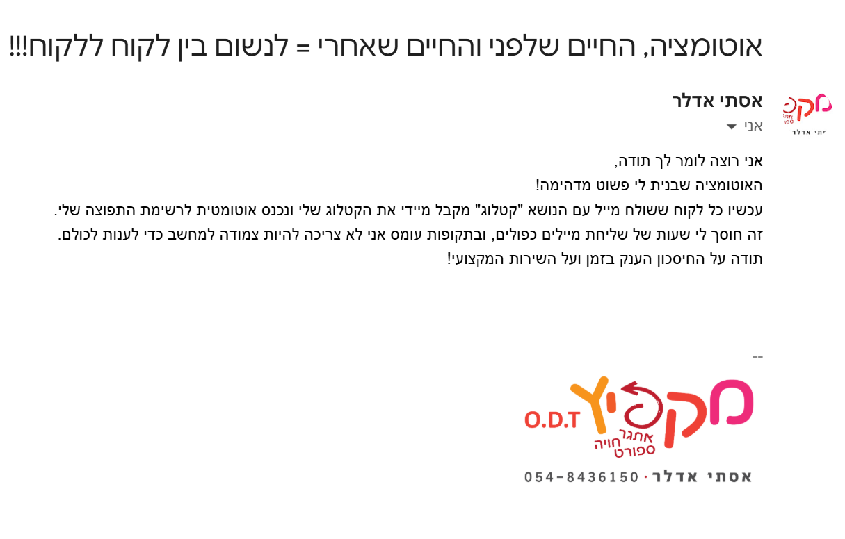 "אני רוצה לומר לך תודה, האוטומציה שבנית לי פשוט מדהימה! עכשיו כל לקוח ששולח מייל עם הנושא "קטלוג" מקבל מיידית את הקטלוג שלי ונכנס אוטומטית לרשימת התפוצה שלי. זה חוסך לי שעות של שליחת מיילים כפולים, ובתקופות עומס אני לא צריכה להיות צמודה למחשב כדי לענות לכולם. תודה על החיסכון הענק בזמן ועל השירות המקצועי!"